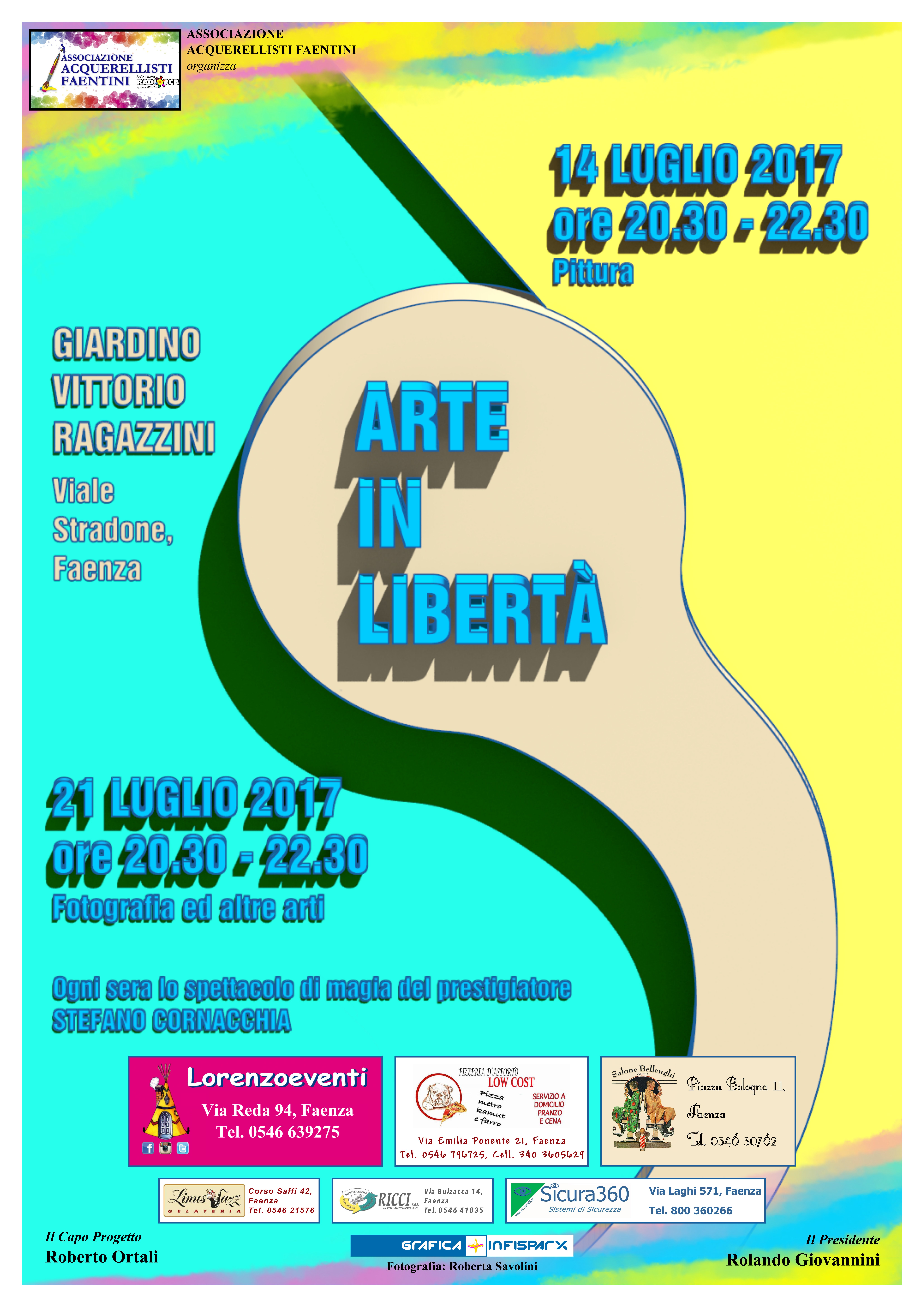 ‘Arte in libertà‘ è una serie di incontri pubblici che l’Associazione Acquerellisti Faentini tiene nei venerdî sera del mese di luglio, all’interno del “Giardino degli Acquerellisti” (noto anche come “Giardino Vittorio Ragazzini”) nel Viale Stradone di Faenza. In ognuna di queste serate si dà la possibilità, a chiunque lo desideri, di esprimere la propria creatività esponendo le proprie opere, o tenendo i propri spettacoli, all’interno del parco. Questo è il manifesto per l‘edizione 2017