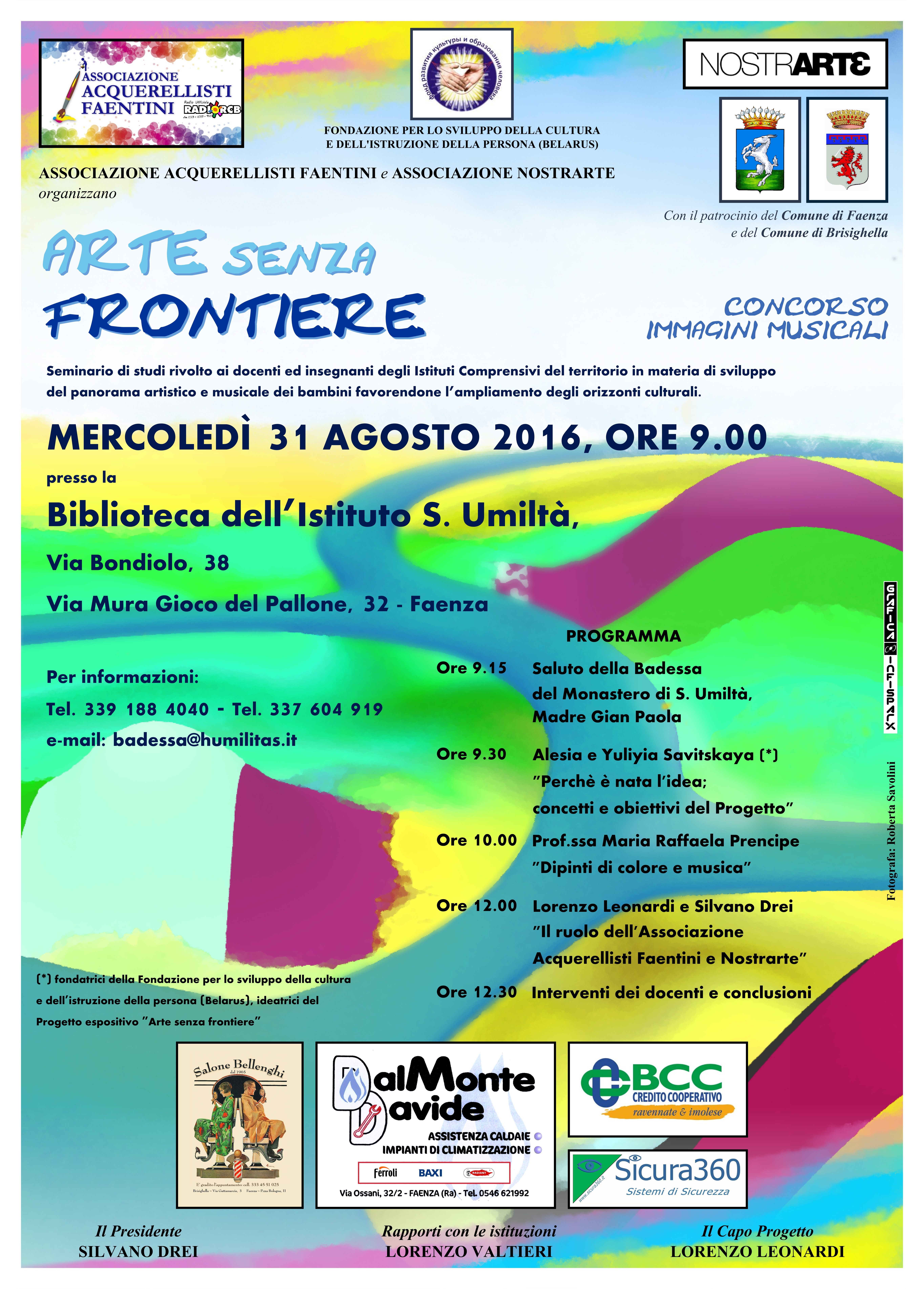 ‘Arte Senza Frontiere‘ è un progetto europeo organizzato tra Italia, Bielorussia e Germania per favorire la conoscenza dell‘arte ai bambini delle scuole. La particolarità di questo progetto è che esso prevede che i bambini partecipanti ascoltino dei brani di musica classica ed in seguito dipingano dei quadri ispirandosi solamente alle sensazioni che tali canzoni fanno provare a loro.