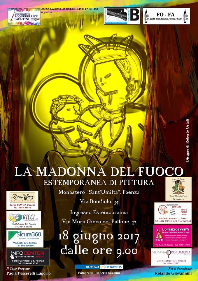InfiSparx ha seguito anche l‘estemporanea di pittura ‘La Madonna del Fuoco‘, organizzata dall‘Associazione Acquerellisti Faentini presso il Monastero Sant‘Umiltà di Faenza. Il disegno usato in questo manifesto è stato anche riportato in una cartella data omaggio a tutti gli artisti partecipanti, contenete materiale informativo sulla Madonna del Fuoco (nata da due eventi, faentino e forlivese, secondo cui un incendio che distrusse completamente una chiesa non intaccò l‘immagine di una Madonna, che da allora prende questo nome). Questa è una foto delle targhe per i vincitori dell‘estemporanea con l‘immagine usata del manifesto (foto delle targhe: Roberta Savolini).