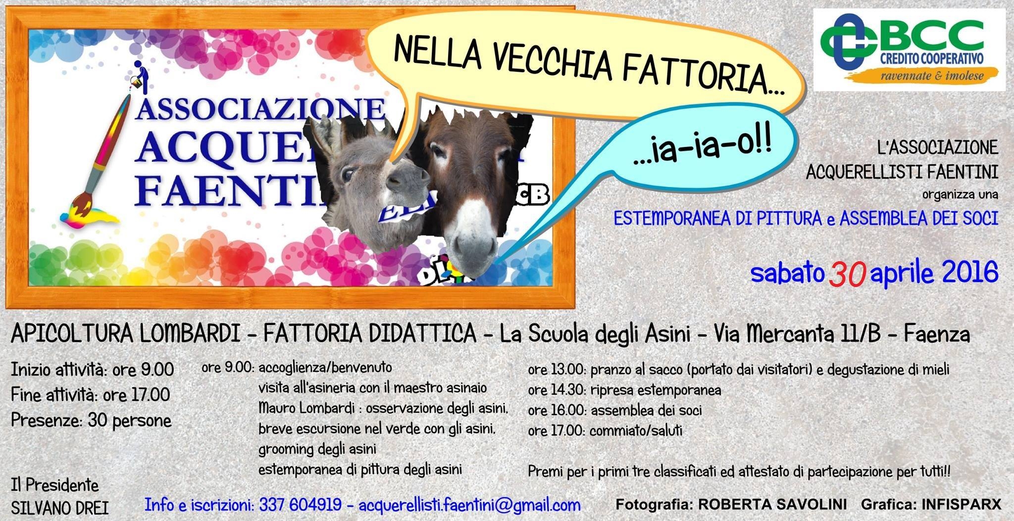 Questo è un invito per un‘Estemporanea di pittura dell‘Associazione Acquerellisti Faentini intitolata ‘Nella vecchia Fattoria... ia-ia-o!‘, che si è tenuta presso l‘apicoltura e agriturismo Lombardi, sulle colline di Faenza. L‘azienda ha fatto delle attività con gli asini, che spaziano dalle cavalcate all‘educazione al rispetto per la natura e gli animali, passando per le cure mediche attraverso la pet therapy, il loro lavoro principale, aiutati in questo nei simpatici ed amichevoli esemplari femmina in loro possesso.